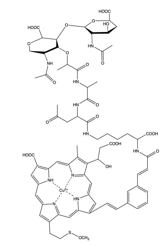 Higher-resolution structure of Spice Melange. Notes: (1.) The cis/trans isomerism of the two alkene groups is uncertain. (2.) It is unknown if one or two copper ions coordinate the heme group.